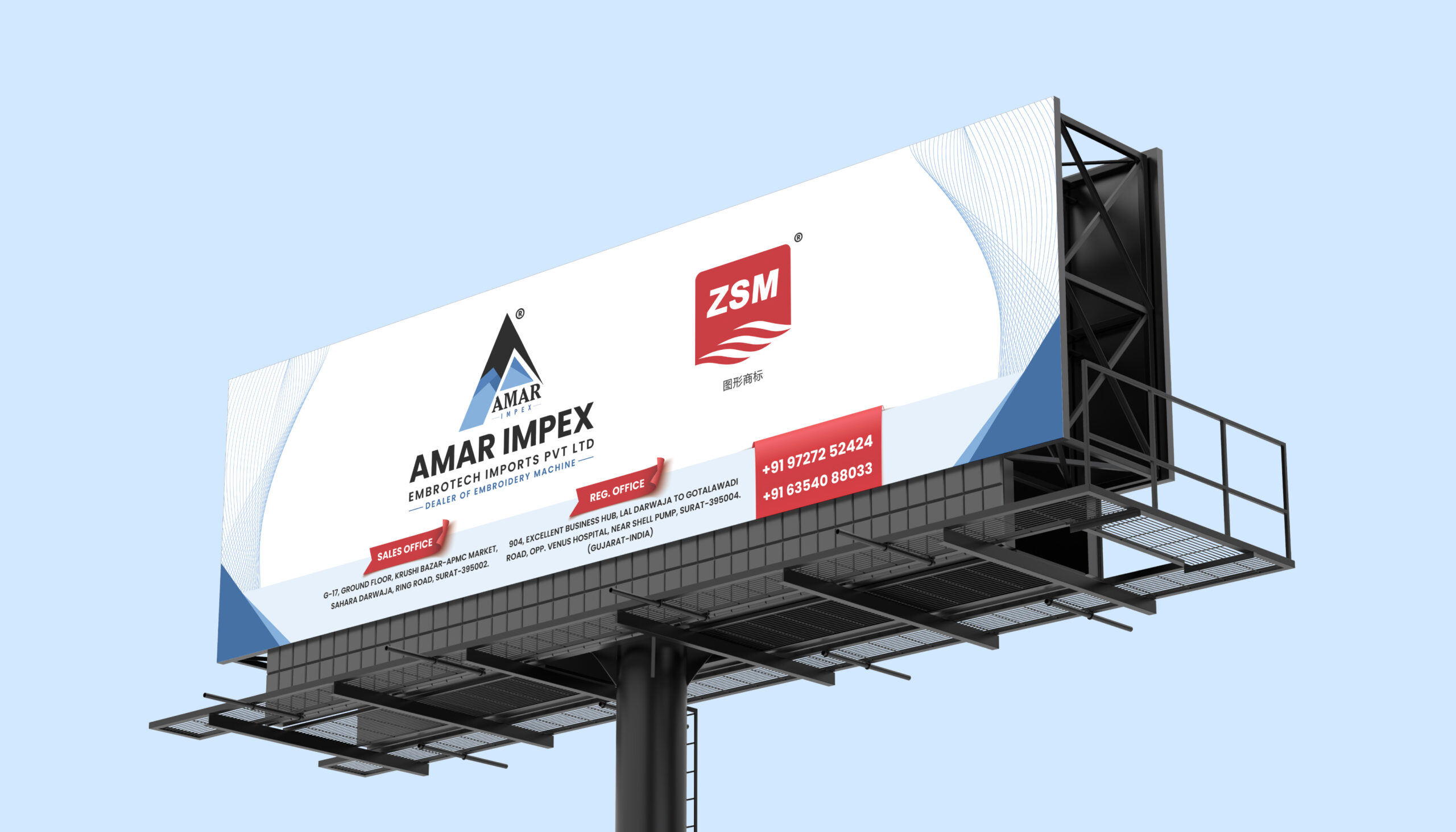 Amar Impex, based in Surat, is the exclusive authorized dealer of ZSM embroidery machines in India for the past 11 years, establishing itself as a trusted name in the embroidery machinery industry. One.25 Tech & Design created comprehensive marketing materials including social media posts, digital marketing campaigns, and stationery design—executed by a graphic design company Gujarat team with standards of a top graphic design company India and best branding company India approach, reflecting branding agency Surat and creative agency Surat excellence.