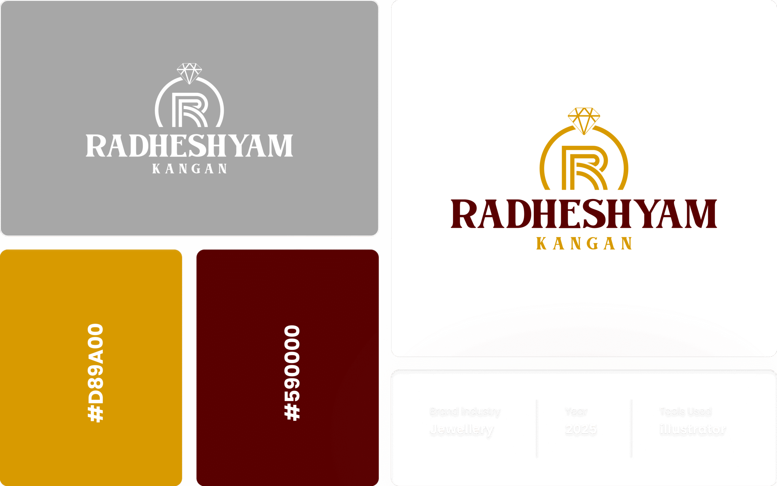 Radheshyam Kangan, based in Surat, is a traditional jewelry store specializing in customized kangan designs and signature jewelry pieces with authentic craftsmanship. One.25 Tech & Design created their distinctive brand identity with logo design and color palette—executed by best logo design agency surat team with standards of best logo design in india and best branding company india approach, reflecting branding agency surat, creative agency surat, and brand identity design expertise.